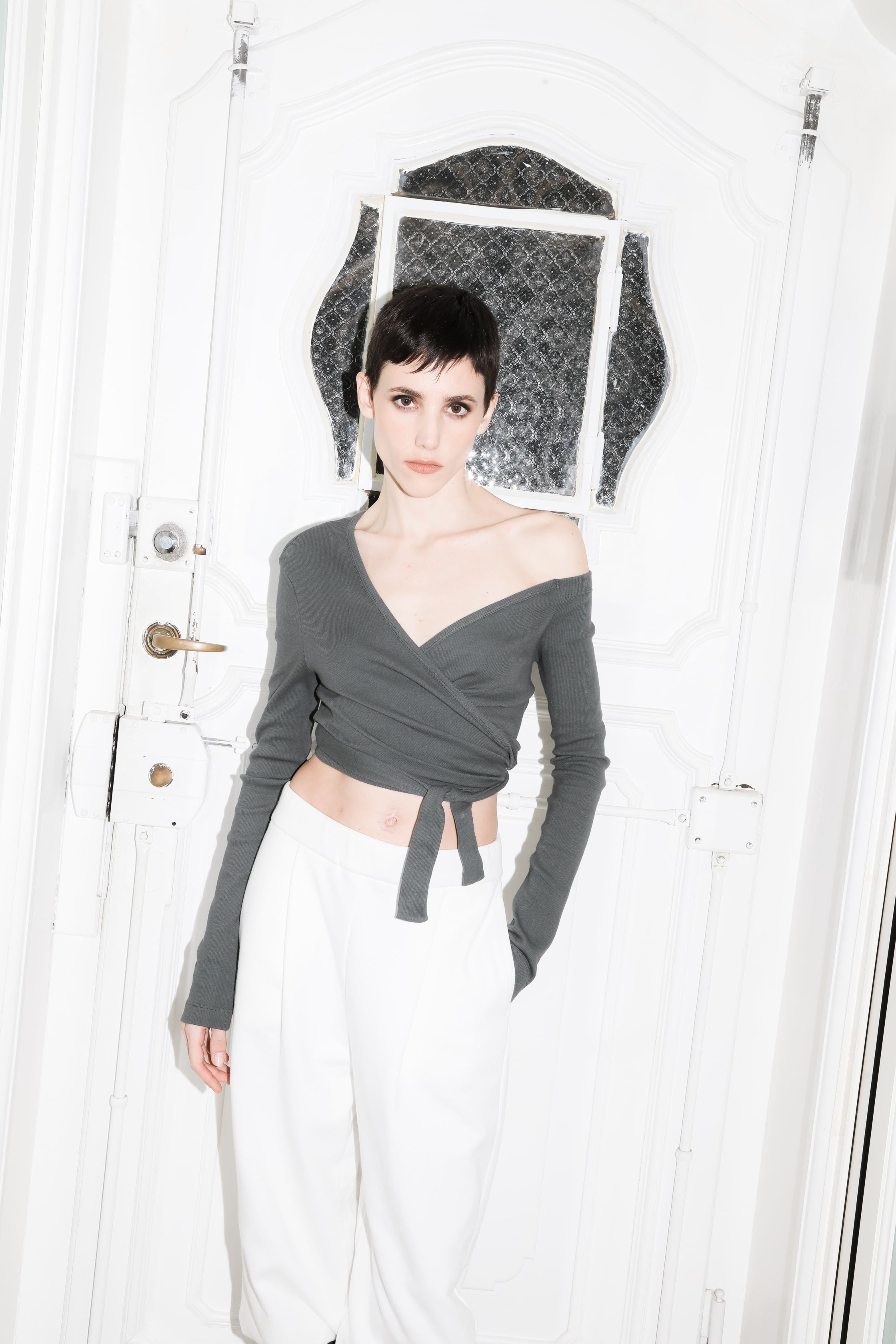 Off-shoulder long-sleeve ballerina top with a wrapped front.