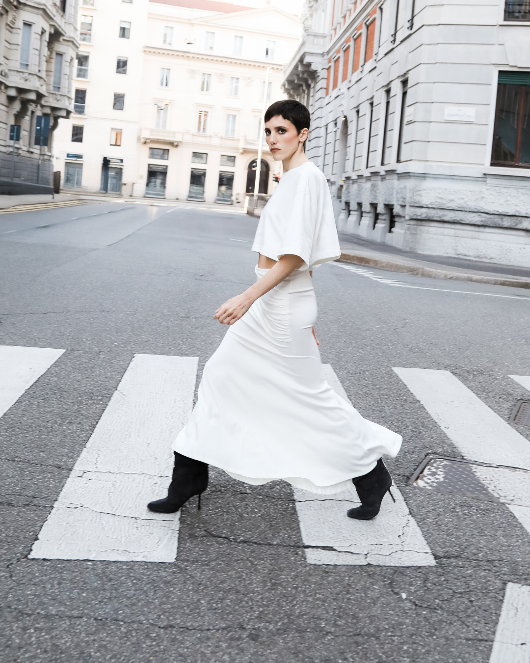 Long mermaid-cut skirt with fitted draped hips and back zipper.