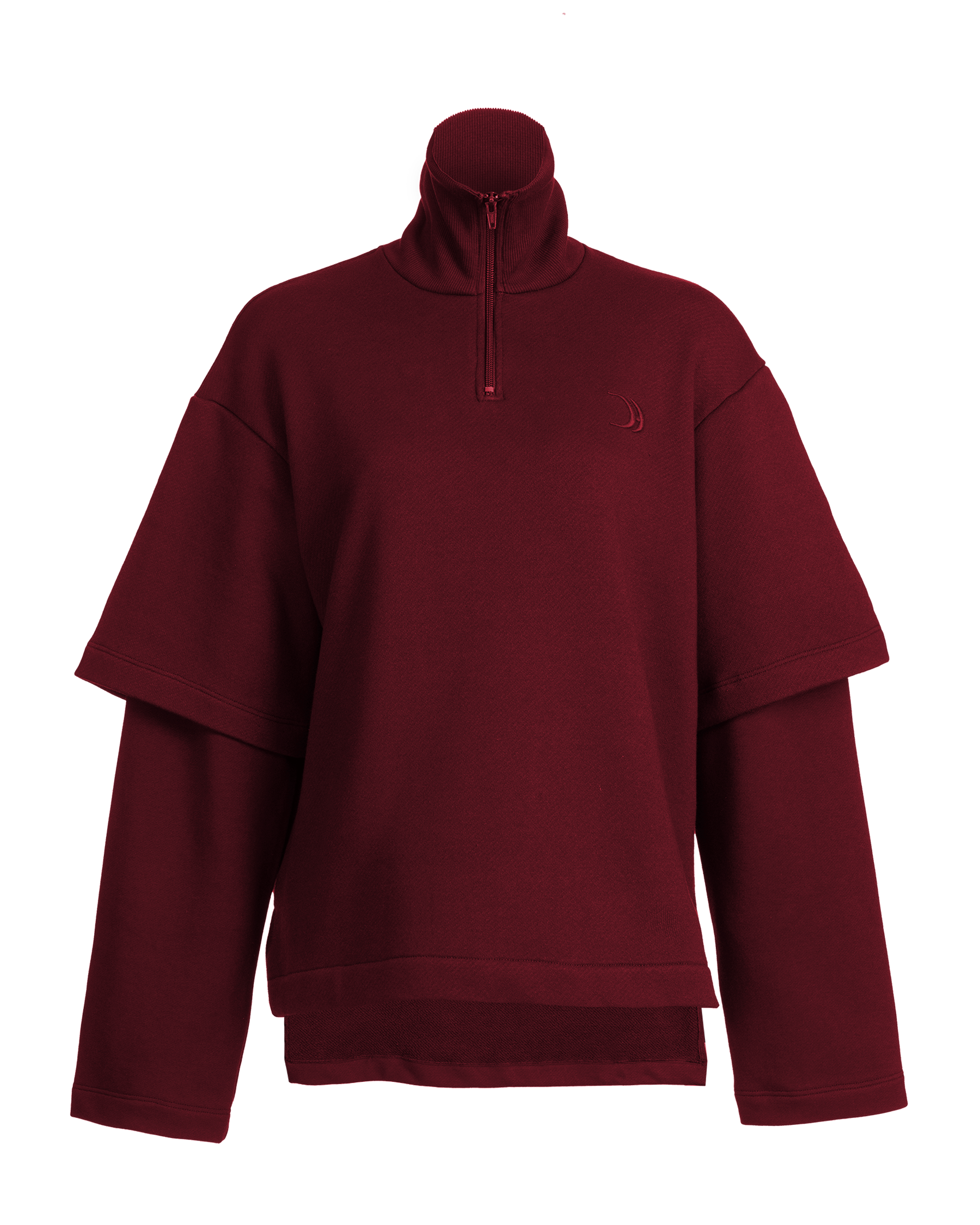 Oversize polo sweatshirt with high zipped collar and layered double sleeves.